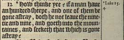 12 *How thinke yee? if a man haue an hundred sheepe, and one of them be gone astray, doth he not leaue the ninetie and nine, and goeth into the mountaines, and seeketh that which is gone astray?[*Luke 15.4.]