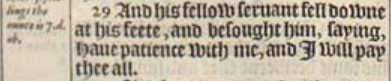 29 And his fellow seruant fell downe at his feete, and besought him, saying, Haue patience with me, and I will pay thee all.