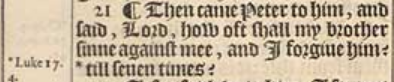 21 ¶ Then came Peter to him, and said, Lord, how oft shall my brother sinne against mee, and I forgiue him? *till seuen times?[*Luke 17.4.]