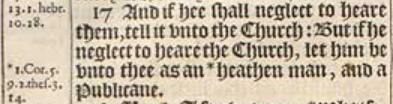 17 And if hee shall neglect to heare them, tell it vnto the Church: But if he neglect to heare the Church, let him be vnto thee as an *heathen man, and a Publicane.[*1. Cor.5.9. 2. thes. 3.14.]