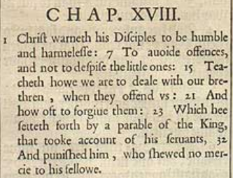 1 Christus warnt seine Jünger bescheiden und arglos zu sein: 7 Um Verleitungen zu vermeiden und die Kleinen nicht geringzuschätzen: 15 Lehrt wie wir mit unseren Brüdern umgehen sollen, wenn sie uns verleiten: 21 Und ihnen wie oft zu vergeben: 23 Was er durch die Parabel des Königs, der mit seinen Dienern abrechnete, vorträgt, 32 Und straft ihn, der seinem Kameraden kein Erbarmen zeigte.