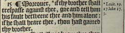 15 ¶ Moreouer, *if thy brother shall trespasse against thee, goe and tell him his fault betweene thee and him alone: if he shall heare thee, thou hast gained thy brother.[*Leuit. 19.17. luke 17.3.]