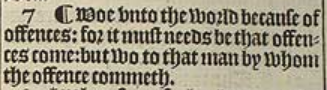 7 Woe vnto the world because of offences: for it must needs be that offences come: but wo to that man by whom the offence commeth.