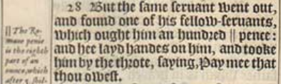 28 Aber der gleiche Diener ging hinaus und fand einen seiner Mitdiener, der ihm einhundert ||Pence schuldete: Und er legt seine Hände an ihn und nahm ihm beim Hals und sagte ‘Zahl mir, was du mir schuldest.’[||Der römische Penny ist der achte Teil einer Unze, welche bei 5 Schilling je Unze 7 Pence ist]