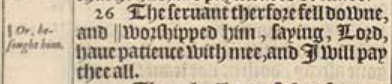 26 The seruant therfore fell downe, and || worshipped him, saying, Lord, haue patience with mee, and I will pay thee all.[|| Or, besought him.]