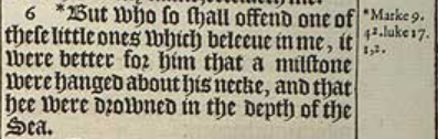 6 *But who so shall offend one of these little ones which beleeue in me, it were better for him that a milstone were hanged about his necke, and that hee were drowned in the depth of the Sea.[*Marke 9.42. luke 17.1,2.]