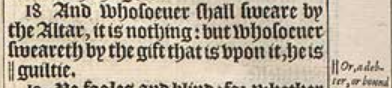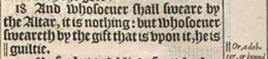 18 ‘Und wer auch immer beim Altar schwört, es bedeutet nichts: Aber wer auch immer beim Opfer, das auf ihm ist, schwört, der ist ||schuldig.’[||oder: ein Schuldner, oder gebunden]