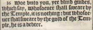 16 Woe vnto you, yee blind guides, which say, Whosoeuer shall sweare by the Temple, it is nothing: but whosoeuer shal sweare by the gold of the Temple, he is a debter.