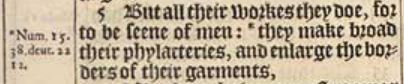 5 But all their workes they doe, for to be seene of men: *they make broad their phylacteries, and enlarge the borders of their garments,[*Num.15.38. deut. 22.12.]