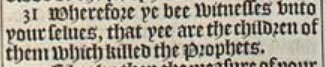 31 Wherefore ye bee witnesses vnto your selues, that yee are the children of them which killed the Prophets.