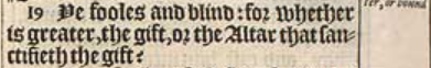 19 Ye fooles and blind: for whether is greater, the gift, or the Altar that sanctifieth the gift?