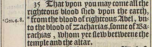 35 That vpon you may come all the righteous blood shed vpon the earth, *from the blood of righteous Abel, vnto the blood of Zacharias, sonne of Barachias, whom yee slew betweene the temple and the altar.[*Gen.4.8.]