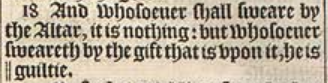 18 And whosoeuer shall sweare by the Altar, it is nothing: but whosoeuer sweareth by the gift that is vpon it, he is || guiltie.[||Or, a debter, or bound]