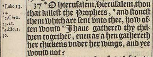 37 *O Hierusalem, Hierusalem, thou that killest the Prophets, *and stonest them which are sent vnto thee, how often would *I haue gathered thy children together, euen as a hen gathereth her chickens vnder her wings, and yee would not?[*Luke 13.34. , *2.Chro. 24.21. , *4. Esd. 1.30.]
