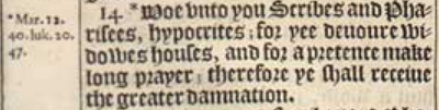 14 *Woe vnto you Scribes and Pharisees, hypocrites; for yee deuoure widowes houses, and for a pretence make long prayer; therefore ye shall receiue the greater damnation.[*Mar. 12.40. luk.20.47.]