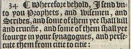34 ¶ Wherefore behold, I send vnto you Prophets, and wisemen, and Scribes, and some of them yee shall kill and crucifie, and some of them shall yee scourge in your synagogues, and persecute them from citie to citie: