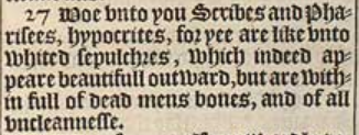 27 Woe vnto you Scribes and Pharisees, hypocrites, for yee are like vnto whited sepulchres, which indeed appeare beautifull outward, but are within full of dead mens bones, and of all vncleannesse.
