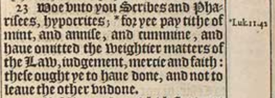 23 Woe vnto you Scribes and Pharisees, hypocrites; *for yee pay tithe of mint, and annise, and cummine, and haue omitted the weightier matters of the Law, iudgement, mercie and faith: these ought ye to haue done, and not to leaue the other vndone.[*Luk. 11.42]