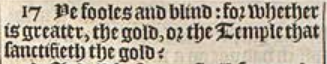 17 Ye fooles and blind: for whether is greater, the gold, or the Temple that sanctifieth the gold?