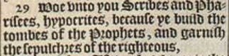 29 Woe vnto you Scribes and Pharisees, hypocrites, because ye build the tombes of the Prophets, and garnish the sepulchres of the righteous,