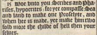 15 Woe vnto you Scribes and Pharises, hypocrites; for yee compasse Sea and land to make one Proselyte, and when hee is made, yee make him two fold more the childe of hell then your selues.