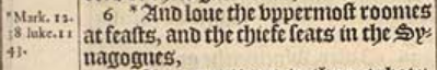 6 *And loue the vppermost roomes at feasts, and the chiefe seats in the Synagogues,[*Mark. 12.38. luke. 11.43.]