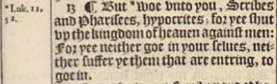 13 ¶ But *woe vnto you, Scribes and Pharisees, hypocrites; for yee shut vp the kingdom of heauen against men: For yee neither goe in your selues, neither suffer ye them that are entring, to goe in.[*Luk. 11.52.]
