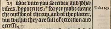 25 Woe vnto you Scribes and Pharisees, hypocrites; *for yee make cleane the outside of the cup, and of the platter, but within they are full of extortion and excesse.[*Luk 11.39]