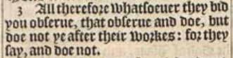 3 All therefore whatsoeuer they bid you obserue, that obserue and doe, but doe not ye after their workes: for they say, and doe not.