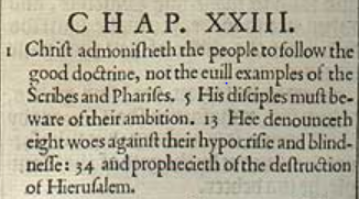1 Christus ermahnt die Leute der guten Lehre zu folgen, nicht den bösen Beispielen der Schriftgelehrten und Pharisäer. 5 Seine Jünger müssen ihren Ehrgeiz vermeiden. 13 Er verkündet acht Wehrufe gegen ihre Heuchelei und Blindheit: 34 Und prophezeit die Zerstörung Jerusalems.