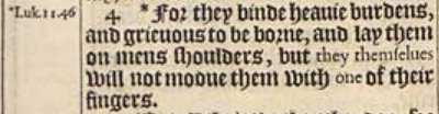 4 *For they binde heauie burdens, and grieuous to be borne, and lay them on mens shoulders, but they themselues will not mooue them with one of their fingers.[*Luk.11.46]