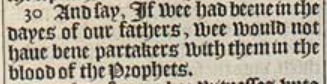 30 And say, If wee had beene in the dayes of our fathers, wee would not haue bene partakers with them in the blood of the Prophets.