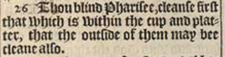 26 Thou blind Pharisee, cleanse first that which is within the cup and platter, that the outside of them may bee cleane also.