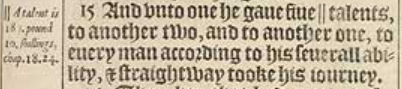 15 And vnto one he gaue fiue ||talents, to another two, and to another one, to euery man according to his seuerall ability, & straightway tooke his iourney.[ ||A talent is 187. pound 10. shillings, chap. 18.24. ]