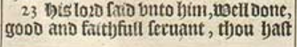 23 His lord said vnto him, Well done, good and faithfull seruant, thou hast beene faithfull ouer a few things, I wil make thee ruler ouer many things: enter thou into the ioy of thy lord.