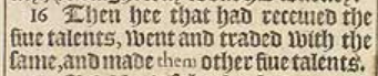 16 Then hee that had receiued the fiue talents, went and traded with the same, and made them other fiue talents.