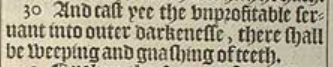 30 And cast yee the vnprofitable seruant into outer darkenesse, there shall be weeping and gnashing of teeth.