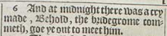 6 And at midnight there was a cry made, Behold, the bridegrome commeth, goe ye out to meet him.