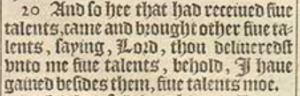 20 And so hee that had receiued fiue talents, came and brought other fiue talents, saying, Lord, thou deliueredst vnto me fiue talents, behold, I haue gained besides them, fiue talents moe.