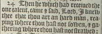 24 Then he which had receiued the one talent, came & said, Lord, I knew thee that thou art an hard man, reaping where thou hast not sowen, & gathering where thou hast not strawed: