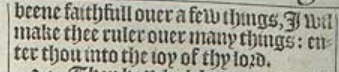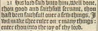 21 His lord said vnto him, Well done, thou good and faithfull seruant, thou hast been faithfull ouer a few things, I wil make thee ruler ouer many things: enter thou into the ioy of thy lord.
