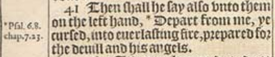 41 Then shall he say also vnto them on the left hand, *Depart from me, ye cursed, into euerlasting fire, prepared for the deuill and his angels.[*Psal. 6.8. chap. 7.23.]