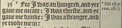 35 *For I was an hungred, and yee gaue me meate: I was thirstie, and ye gaue me drinke: I was a stranger, and ye tooke me in:[*Esai 58.7. ezec. 18.7.]