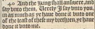40 And the King shall answere, and say vnto them, Uerely I say vnto you, in as much as ye haue done it vnto one of the least of these my brethren, ye haue done it vnto me.