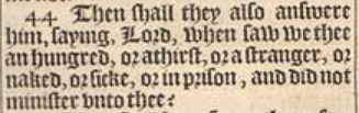 44 Then shall they also answere him, saying, Lord, when saw we thee an hungred, or athirst, or a stranger, or naked, or sicke, or in prison, and did not minister vnto thee?