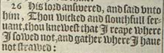 26 His lord answered, and said vnto him, Thou wicked and slouthfull seruant, thou knewest that I reape where I sowed not, and gather where I haue not strawed: