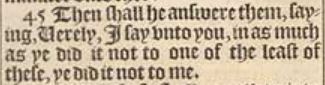 45 Then shall he answere them, saying, Uerely, I say vnto you, in as much as ye did it not to one of the least of these, ye did it not to me.