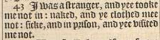 43 I was a stranger, and yee tooke me not in: naked, and ye clothed mee not: sicke, and in prison, and yee visited me not.