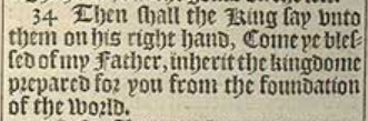 34 Then shall the King say vnto them on his right hand, Come ye blessed of my Father, inherit the kingdome prepared for you from the foundation of the world.