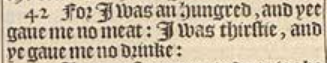 42 For I was an hungred, and yee gaue me no meat: I was thirstie, and ye gaue me no drinke: